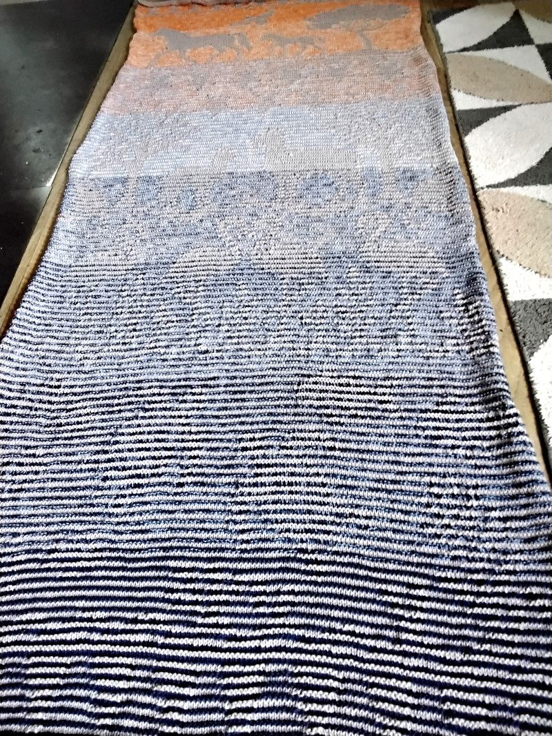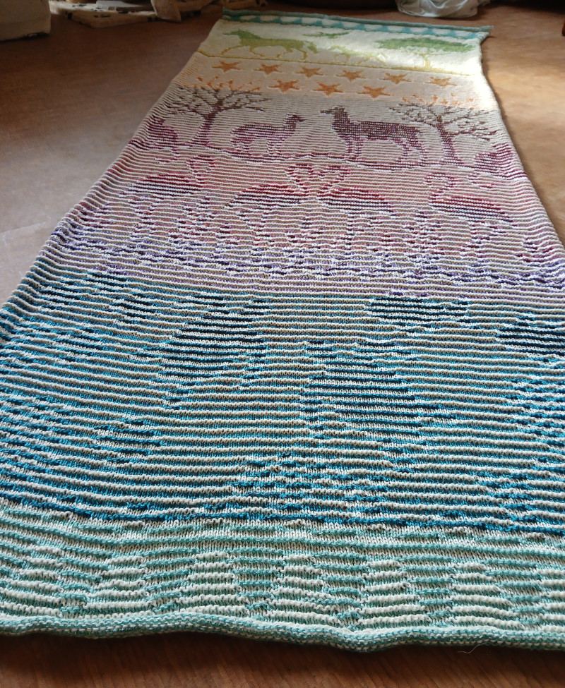 Und Sabine hat aus Metallico weiße Motive auf einem wunderbaren Farbübergang gestrickt. Das Schmuckstück ist übrigens 208 x 146cm groß.
