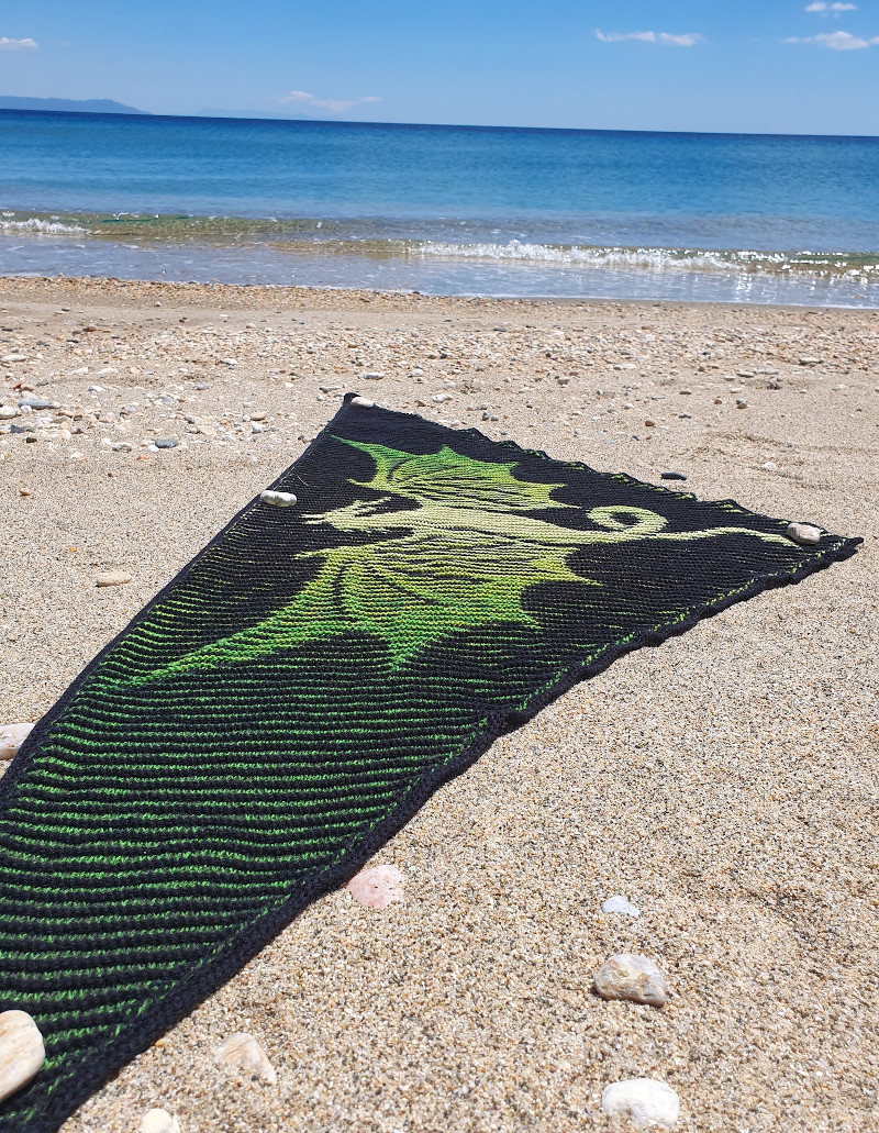 Das grüne Drachentuch wurde mit Wolle von Lana Grossa Cool Wool Print, Cool Wool Uni sowie Brillino als Beilauf-Faden mit Nadeln in Stärke. 4 gestrickt.